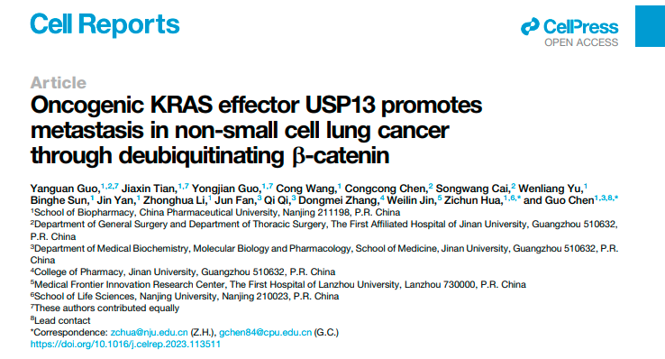 百家乐单机游戏 陈果教授课题组在Cell Reports期刊上发表了题为Oncogenic KRAS effector USP13 promotes metastasis in non-small cell lung cancer through deubiquitinating β-Catenin的文章。该研究发现KRAS激活上调去泛素化酶USP13,是KRAS突变肿瘤的一个新的下游效应蛋白。USP13促进肺癌细胞转移,其高表达与肺癌患者不良预后高度相关。